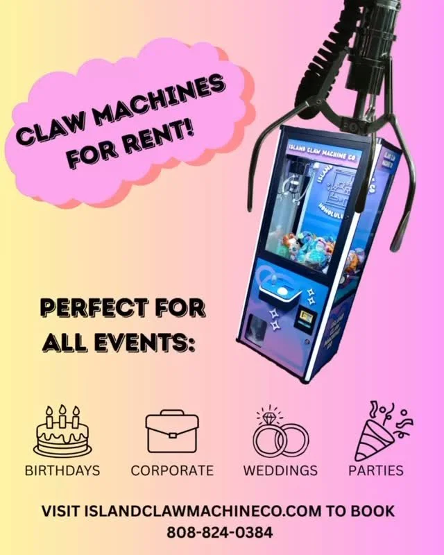 Island Claw Machine Co. provides custom claw machine experiences to birthday parties, graduations, weddings, corporate events, and more.
